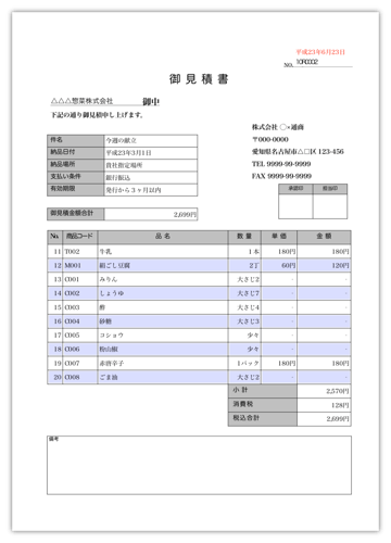 [12, "M001", "絹ごし豆腐", "2丁", 60, 120],